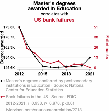 This means 87% of the change in the one variable (i.e., US bank failures) is predictable based on the change in the other (i.e., Master's degrees awarded in Education) over the 10 years from 2012 through 2021.