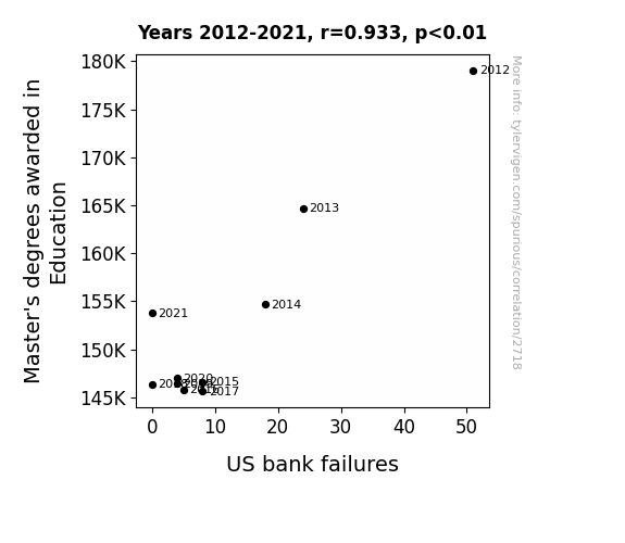 The tantalizing tango of numbers and variables has led us to uncover a striking connection between the number of Master's degrees awarded in Education and the rollercoaster of US bank failures. Through our statistical sleuthing, we stumbled upon a correlation coefficient of 0.9326621, indicating a remarkably strong relationship between these seemingly disparate domains. Picture a teacher and a banker waltzing cheek to cheek - that's the kind of unexpected partnership we're dealing with here!