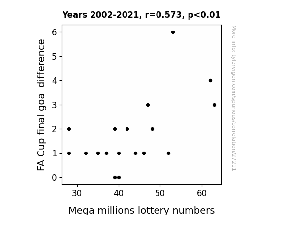 This means 32.9% of the change in the one variable (i.e., Mega millions lottery numbers) is predictable based on the change in the other (i.e., FA Cup final goal difference) over the 20 years from 2002 through 2021.