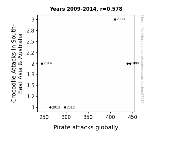 This means 33.5% of the change in the one variable (i.e., Pirate attacks globally) is predictable based on the change in the other (i.e., Crocodile Attacks in South-East Asia & Australia) over the 6 years from 2009 through 2014.