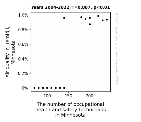 This means 78.6% of the change in the one variable (i.e., The number of occupational health and safety technicians in Minnesota) is predictable based on the change in the other (i.e., Air quality in Bemidji, Minnesota) over the 19 years from 2004 through 2022.