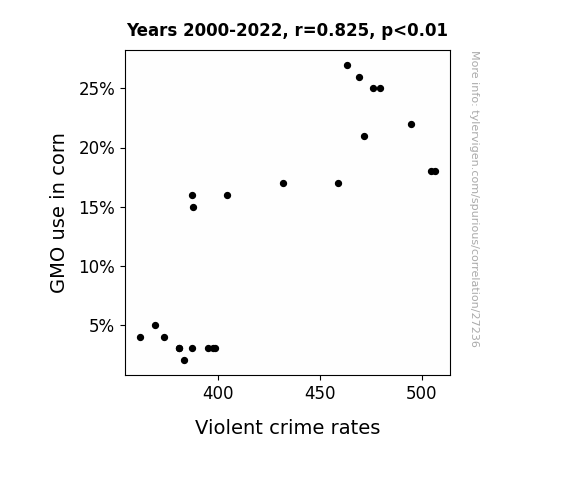 This means 68% of the change in the one variable (i.e., Violent crime rates) is predictable based on the change in the other (i.e., GMO use in corn) over the 23 years from 2000 through 2022.