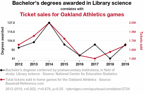 A linear line chart with years as the X-axis and two variables on the Y-axis. The first variable is Bachelor's degrees awarded in Library science and the second variable is Ticket sales for Oakland Athletics games.  The chart goes from 2012 to 2019, and the two variables track closely in value over that time. Small Image