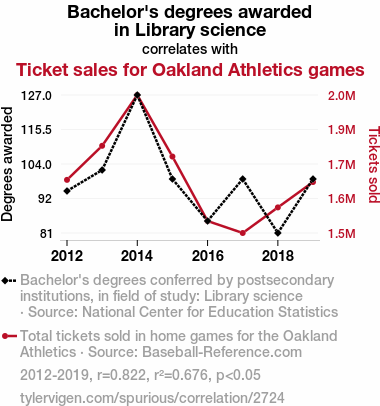 Dewey Decimals, library science, Bachelor's degrees, Oakland Athletics, ticket sales, correlation, National Center for Education Statistics, Baseball-Reference.com, correlation coefficient, p-value, interdisciplinary discussions