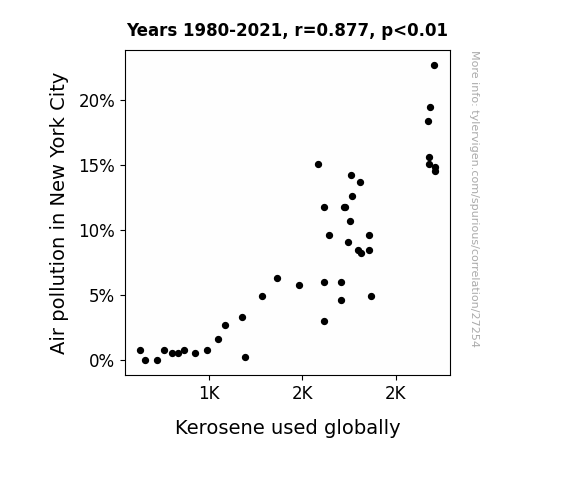 This means 76.9% of the change in the one variable (i.e., Kerosene used globally) is predictable based on the change in the other (i.e., Air pollution in New York City) over the 42 years from 1980 through 2021.