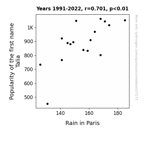 This means 49.2% of the change in the one variable (i.e., Rain in Paris) is predictable based on the change in the other (i.e., Popularity of the first name Talia) over the 17 years from 1991 through 2022.