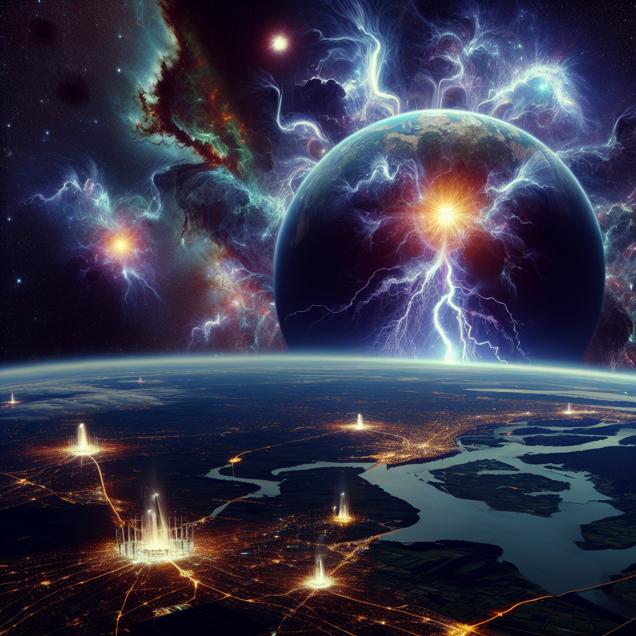 ChatGPT: Generate an image of a breathtaking celestial event in a sci-fi fantasy setting: In the foreground, the night sky over Paraguay is lit up with electrifying bolts of electricity, emanating from a network of futuristic generators. In the background, the planet Uranus slowly drifts away from Earth, creating a stunning alignment of cosmic bodies in the vast expanse of space. The scene is surreal and otherworldly, with the crackling electricity casting an ethereal glow over the landscape.