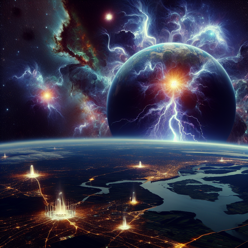 User prompt: Please respond with an image generation prompt that would be likely to create an interesting visual using DALLE-3, using the following style: [ Sci-fi fantasy ] and depicting this scene: In the vast expanse of space, Uranus moves further away from Earth, creating a stunning alignment of the cosmic bodies. As this celestial event unfolds, bolts of electricity crackle through the atmosphere, illuminating the night sky. Meanwhile, in Paraguay, the surge of electrical activity fuels the generators, boosting the electricity production to new heights. Keep the visual depiction simple. Do not include any words or speech bubbles.