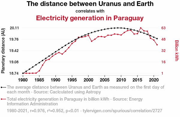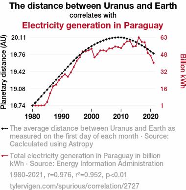 - The spurious research paper: Shocking Connection: An Electrifying Correlation Between The Distance Between Uranus and Earth and Electricity Generation in Paraguay