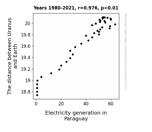 This means 95.2% of the change in the one variable (i.e., Electricity generation in Paraguay) is predictable based on the change in the other (i.e., The distance between Uranus and Earth) over the 42 years from 1980 through 2021.
