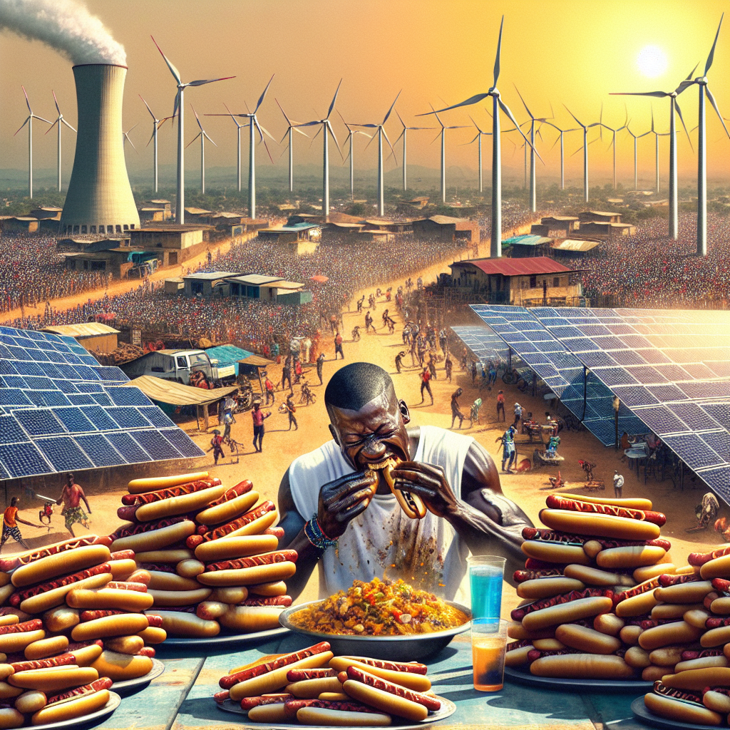 ChatGPT: [ Photorealism ] Generate an image showing a bustling scene in Benin where vibrant solar panels and wind turbines dot the landscape, capturing the vibrant energy of renewable power generation. In the foreground, depict the Nathan's Hot Dog Eating Competition as the champion sits at a table piled high with sizzling hotdogs, emanating an aura of intense determination and energy. The contrast between the renewable energy scene and the competitive eating contest should be vividly portrayed, with a focus on the pulsating life force in both situations.