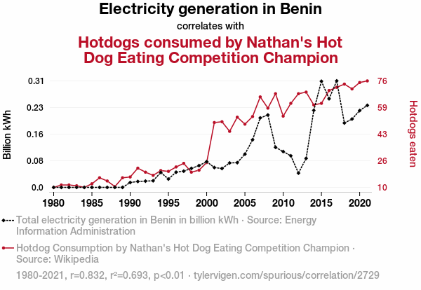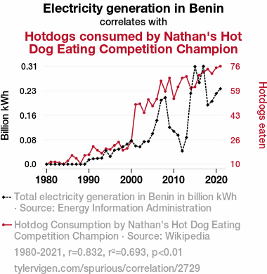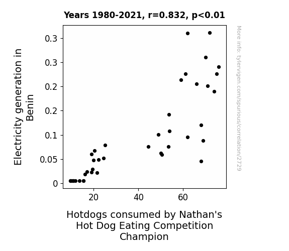 electricity generation, Benin, hotdog consumption, Nathan's Hot Dog Eating Competition, champion, correlation, statistical analysis, significance level, energy production, cylindrical meat products