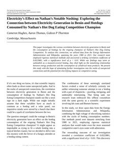 Electricity’s Effect on Nathan’s Notable Noshing: Exploring the Connection between Electricity Generation in Benin and Hotdogs Consumed by Nathan's Hot Dog Eating Competition Champion The Journal of Gastronomic Energy Studies Jan 2024 |