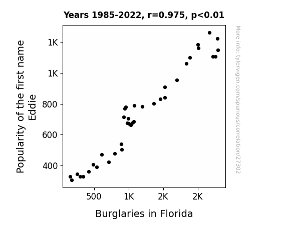 This means 95.1% of the change in the one variable (i.e., Burglaries in Florida) is predictable based on the change in the other (i.e., Popularity of the first name Eddie) over the 38 years from 1985 through 2022.