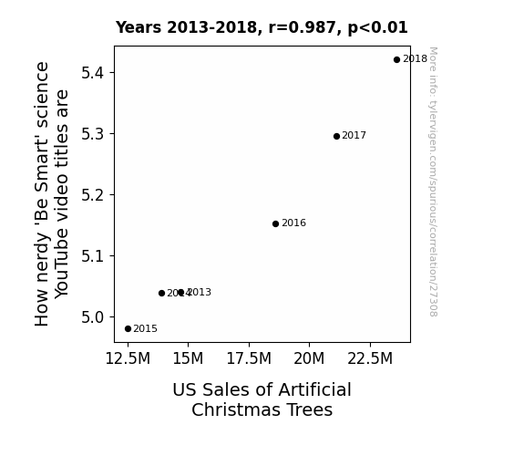 This means 97.4% of the change in the one variable (i.e., US Sales of Artificial Christmas Trees) is predictable based on the change in the other (i.e., How nerdy 'Be Smart' science YouTube video titles are) over the 6 years from 2013 through 2018.