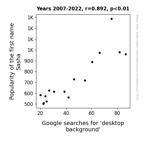 This means 79.6% of the change in the one variable (i.e., Google searches for 'desktop background') is predictable based on the change in the other (i.e., Popularity of the first name Sasha) over the 16 years from 2007 through 2022.