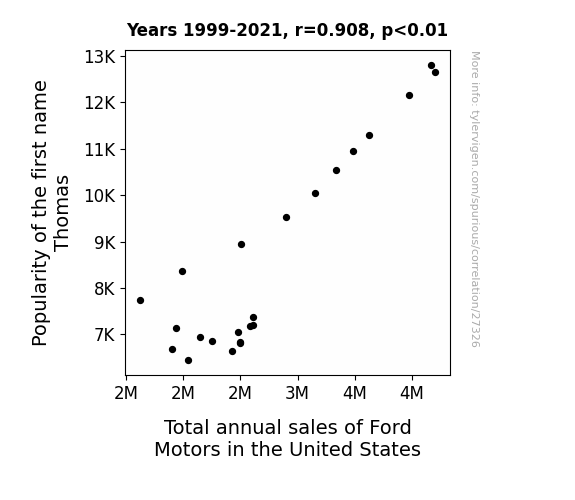 This means 82.5% of the change in the one variable (i.e., Total annual sales of Ford Motors in the United States) is predictable based on the change in the other (i.e., Popularity of the first name Thomas) over the 23 years from 1999 through 2021.