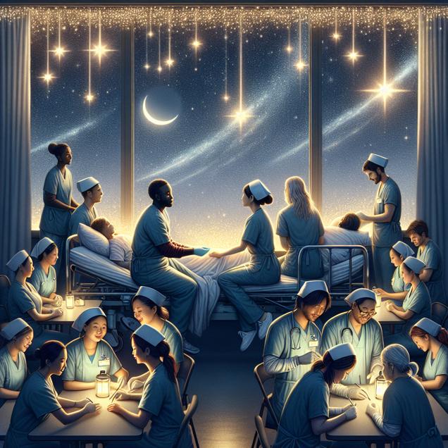 ChatGPT: [ Concept art ] Create a serene and heartwarming scene of a group of diligent nursing assistants in Indiana providing compassionate care under the glow of Venus and Mercury in the clear evening sky. The focus should be on the juxtaposition of the celestial bodies shining brightly above and the devoted healthcare professionals at work below. The lighting should emphasize the warm, comforting atmosphere of the scene, with subtle details that evoke a sense of tranquility and dedication.