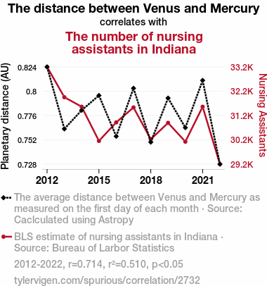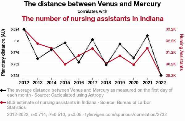 This means 51% of the change in the one variable (i.e., The number of nursing assistants in Indiana) is predictable based on the change in the other (i.e., The distance between Venus and Mercury) over the 11 years from 2012 through 2022.