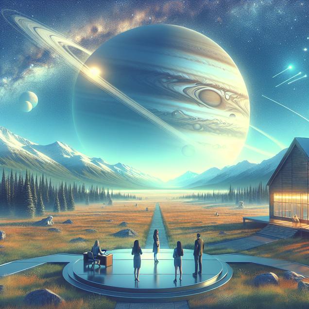 Prompt: Generate an image of a futuristic scene with a vast, open field under a clear blue sky. In the distance, the huge planet Jupiter shines brightly, positioned exactly 484 million miles from the radiant Sun. In this wide landscape, a small wooden building stands amidst the spirited Alaskan wilderness. Outside the building, a small group of three secretaries cheerfully chats while taking a break. The futuristic style should depict an otherworldly ambiance, perhaps with sleek, minimalistic structures and advanced technology subtly integrated into the natural landscape. The depiction should include only scenes, people, and objects, it should not include text or speech bubbles.