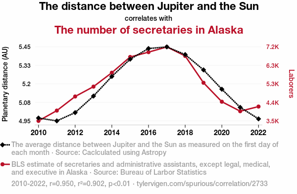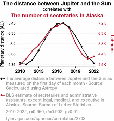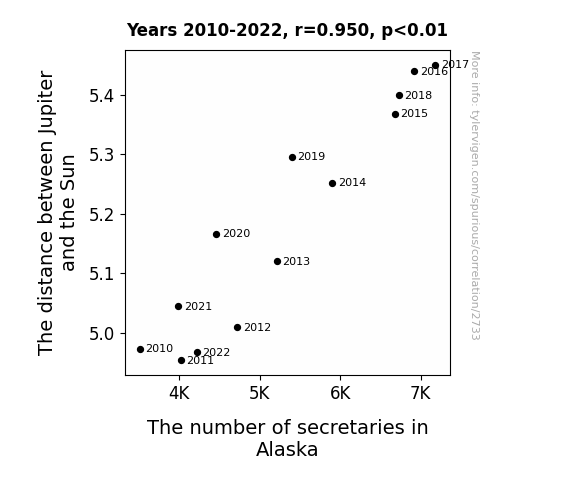 This means 90.2% of the change in the one variable (i.e., The number of secretaries in Alaska) is predictable based on the change in the other (i.e., The distance between Jupiter and the Sun) over the 13 years from 2010 through 2022.