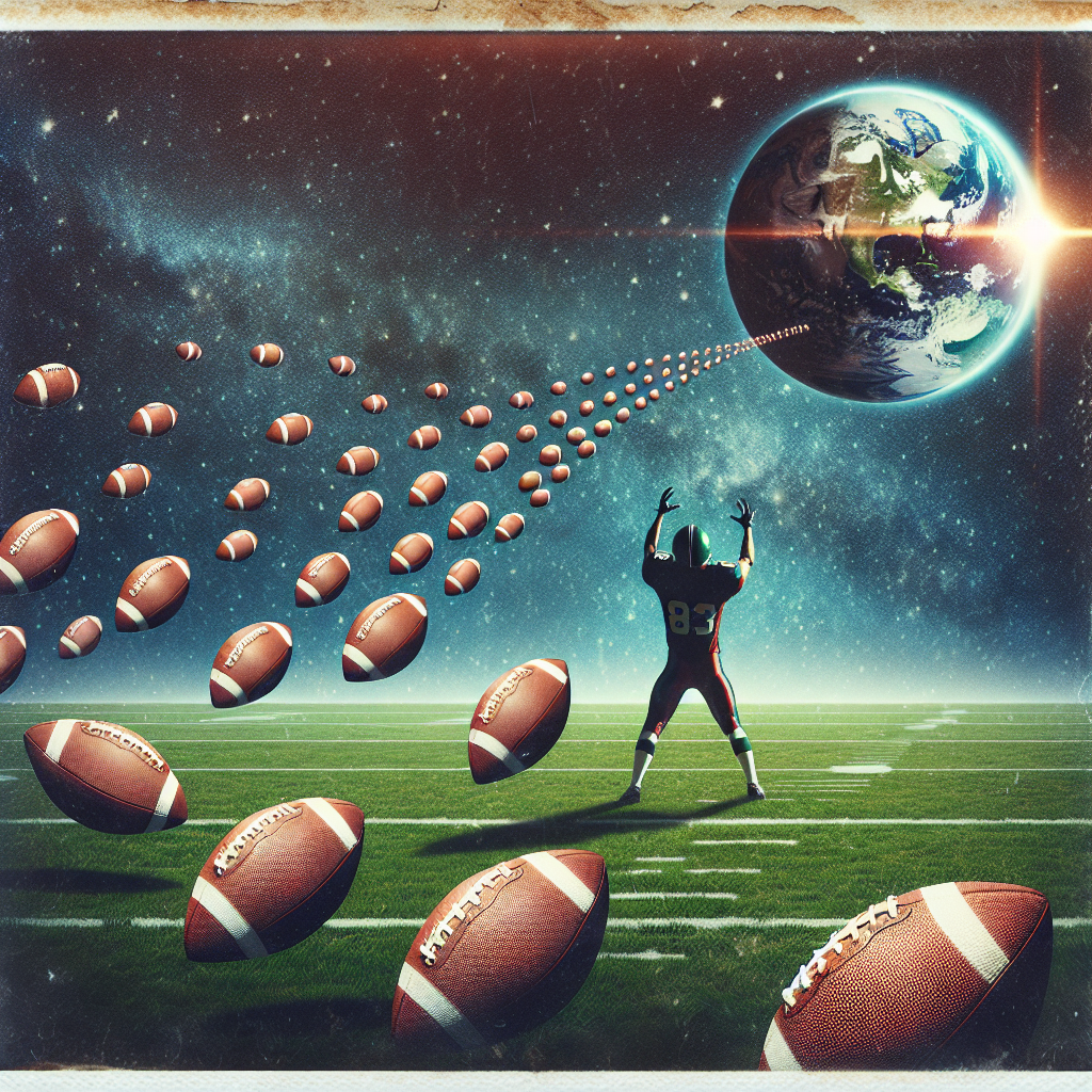 User prompt: Please respond with an image generation prompt that would be likely to create an interesting visual using DALLE-3, using the following style: [ a Polaroid photo ] and depicting this scene: Imagine the Earth drifting farther away from the Sun, as the increasing distance causes a weaker gravitational pull. In this scenario, Steve Smith is on a football field, and as the Earth moves, he makes remarkable catches, creating an impressive trail of footballs with ever-increasing receiving yards, symbolizing his ability to catch longer and more spectacular passes. Keep the visual depiction simple. Do not include any words or speech bubbles.