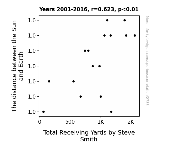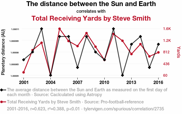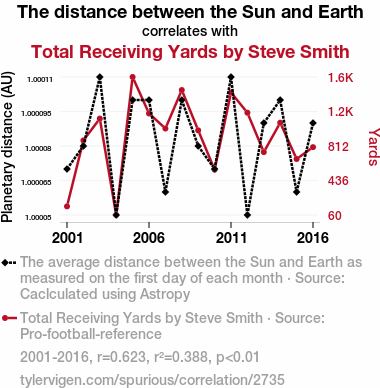 This means 38.8% of the change in the one variable (i.e., Total Receiving Yards by Steve Smith) is predictable based on the change in the other (i.e., The distance between the Sun and Earth) over the 16 years from 2001 through 2016.