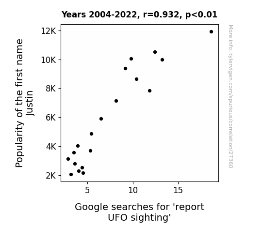 This means 86.8% of the change in the one variable (i.e., Google searches for 'report UFO sighting') is predictable based on the change in the other (i.e., Popularity of the first name Justin) over the 19 years from 2004 through 2022.