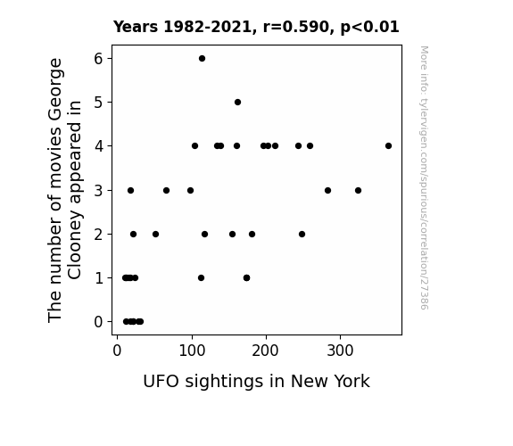 This means 34.8% of the change in the one variable (i.e., UFO sightings in New York) is predictable based on the change in the other (i.e., The number of movies George Clooney appeared in) over the 40 years from 1982 through 2021.