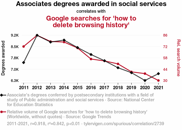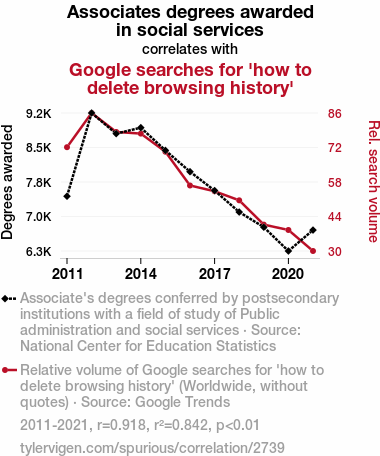 User prompt: Please make up a funny explanation for how a decrease in Associates degrees awarded in Public administration and social services caused how to delete browsing history (Google searches for 'how to delete browsing history') to decrease.