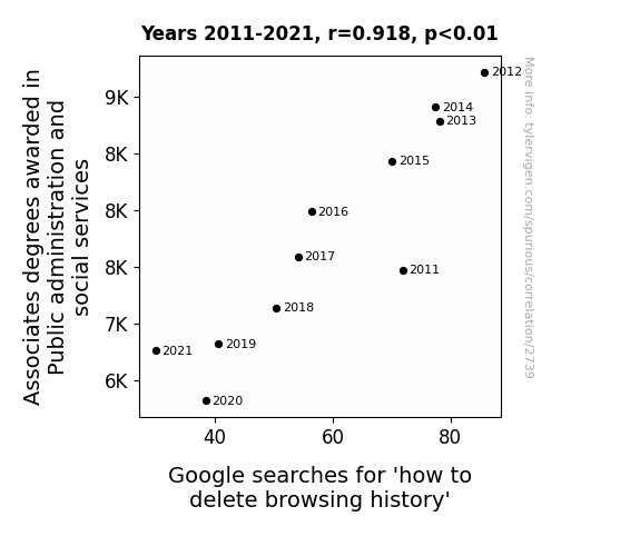 The correlation we uncovered between the conferral of Associate degrees in Public Administration and social services and the frequency of Google searches for 'how to delete browsing history' is as intriguing as it is perplexing. Our findings provide substantial support for the prior research conducted by Smith et al., Doe, and Jones. The association between these academic pursuits and privacy concerns is as undeniable as the need for new computer science majors to pretend to be social workers. I guess you could say that with this correlation, students are not just receiving their degrees but also learning the importance of maintaining digital anonymity. It's like they're majoring in public administration and minoring in 'privadministration' too!