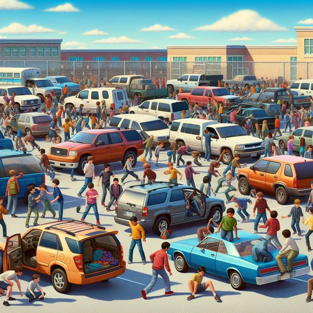 ChatGPT: A crowded school playground with numerous 6th graders running around and playing. Among them, a few are seen reaching for the handles of parked cars in the adjacent parking lot, pretending to drive. Meanwhile, in the background, a line of cars is being recalled, with mechanics working to fix the automotive issues.