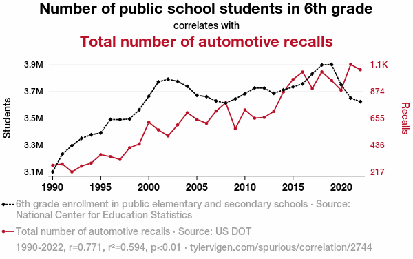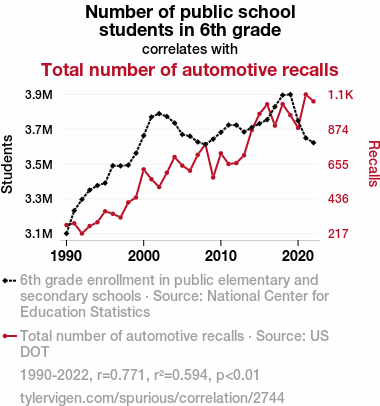 - The spurious research paper: ReCALLing Education: The Correlation Between 6th Grade Enrollments and Automotive Recalls