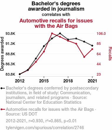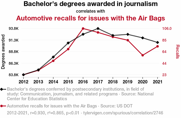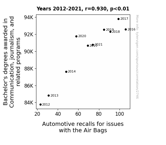 This means 86.5% of the change in the one variable (i.e., Automotive recalls for issues with the Air Bags) is predictable based on the change in the other (i.e., Bachelor's degrees awarded in journalism) over the 10 years from 2012 through 2021.