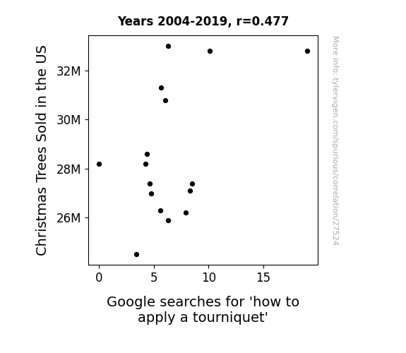 This means 22.8% of the change in the one variable (i.e., Google searches for 'how to apply a tourniquet') is predictable based on the change in the other (i.e., Christmas Trees Sold in the US) over the 16 years from 2004 through 2019.