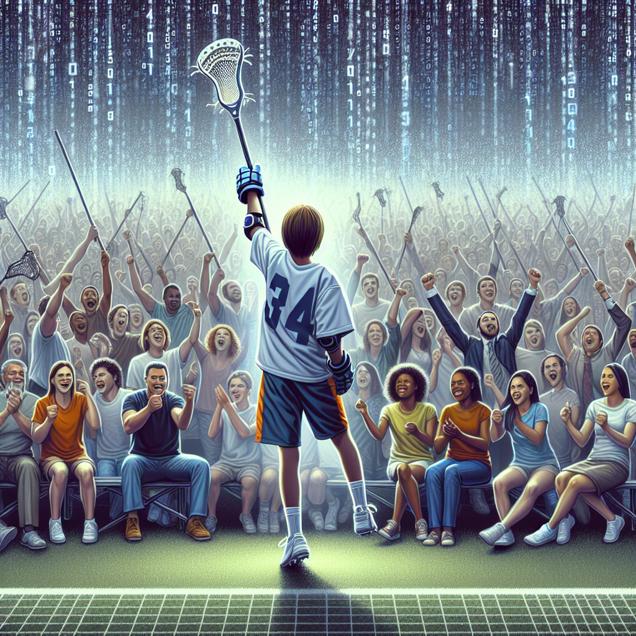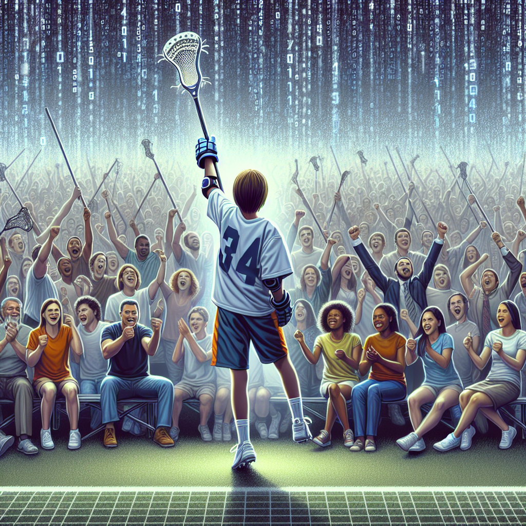 Prompt: Generate an image that combines elements of data cyber art with a scene of a young boy named Braden triumphantly raising his lacrosse stick in front of a cheering crowd after scoring the final point, securing the national championship for his team. The crowd should be depicted in a jubilant and energetic manner, creating a sense of celebration and excitement. The visual should also capture the influence of the popular first name "Braden" on the rise of talented lacrosse players. The depiction should include only scenes, people, and objects, it should not include text or speech bubbles.