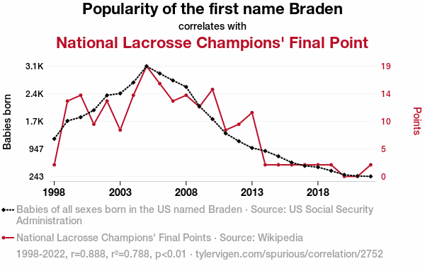 User prompt: Please provide potential search keywords for a paper titled The Braden Effect: A Lacrosse Lullaby with an abstract of The study investigates the peculiar relationship between the popularity of the first name "Braden" and the performance of National Lacrosse Champions in their final point outcomes. Utilizing data from the US Social Security Administration and Wikipedia, the research team delves into this quirky correlation that has left many scratching their heads and pondering the question, "Who knew Braden had such an impact on the lacrosse field?" The correlation coefficient of 0.8878281 and the significant p-value of less than 0.01 for the years 1998 to 2022 reveals the unexpected influence of a name on athletic success.