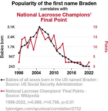 People just couldn't handle the idea of a Lacrosse champion being named Braden. It was as if the universe said, "Nope, can't have a Braden reigning over the lacrosse field." So, in a bizarre twist of fate, as fewer babies were given the name Braden, the cosmic balance shifted, and the National Lacrosse Champions' final point just couldn't align with the Braden energy anymore. It's a plaqued case of intergalactic nomenclature interference, leading to a stick-swinging, goal-missing, Braden-banning conspiracy that has left sports fans bewildered and baby Br.. And that's when the reality check comes in - there's absolutely no logical connection between the popularity of a name and the outcome of a sports event. It's just a quirky coincidence that's as perplexing as trying to understand the infield fly rule in baseball.