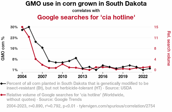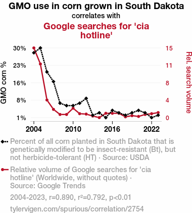 - The spurious research paper: GMO Crop or Google Mischief? Unveiling the 'Maize'y Connection Between GMO Corn in South Dakota and Google Searches for 'CIA Hotline'