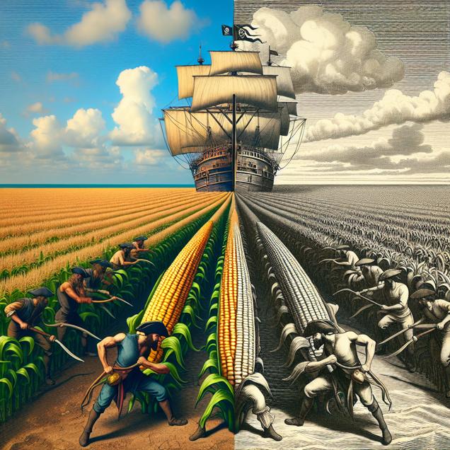 ChatGPT: Generate an image showing a vast cornfield in Kansas, where rows of tall cornstalks sway gracefully in the wind. Some of the cornstalks are labeled "GMO," while others are marked "Non-GMO," creating a visual juxtaposition. In the distance, an imposing pirate ship with a Jolly Roger flag unfurls proudly above the open seas. The ship's crew looks visibly concerned as they struggle to hoist a barrel of rum onto the deck, their chosen fuel source. The absence of ample rum has left them unable to fully power their ship, leading to a decrease in pirate attacks worldwide.