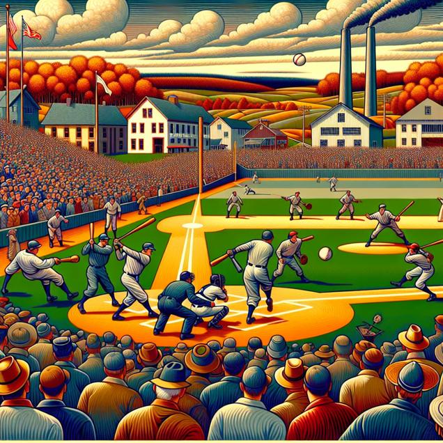 Prompt: Create a photo-realistic image inspired by bauhaus, depicting a vibrant South Dakota town during the World Series. The scene captures the intense baseball game, where batters swing with determination and send the baseball soaring into the autumn sky. The background should include the aroma of freshly baked bread and tobacco filling the air, with crowds of cheering fans. The image should convey the rise in the number of food and tobacco roasting, baking, and drying machine operators and tenders in South Dakota, showcasing the increasing echoes of delectable scents from the countryside. The visual should be simple yet vibrant, capturing the essence of the lively event and the surrounding countryside. The depiction should include only scenes, people, and objects, it should not include text or speech bubbles.