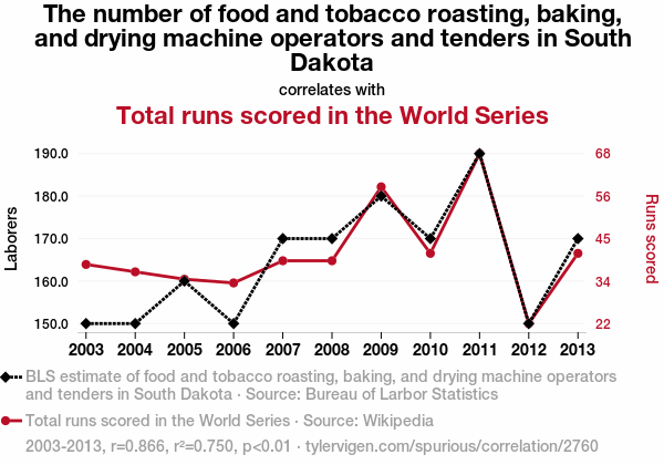 - The spurious research paper: Roasting, Toasting, and Ball Games: The Correlation Between the Number of Food and Tobacco Roasting, Baking, and Drying Machine Operators and Tenders in South Dakota and Total Runs Scored in the World Series
