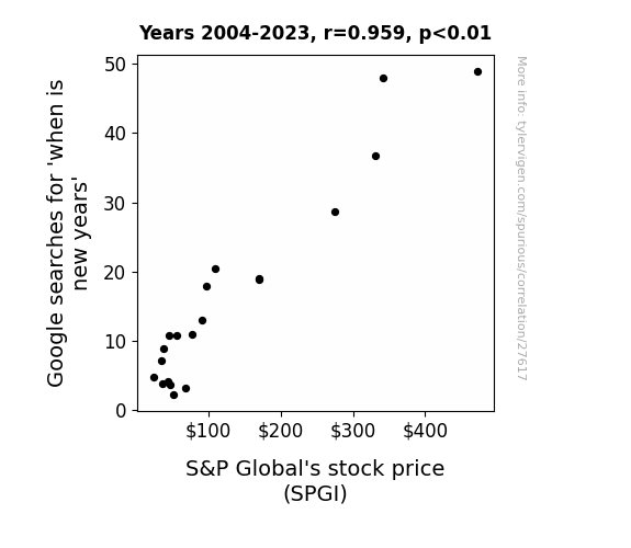 This means 92% of the change in the one variable (i.e., S&P Global's stock price (SPGI)) is predictable based on the change in the other (i.e., Google searches for 'when is new years') over the 20 years from 2004 through 2023.