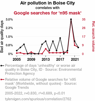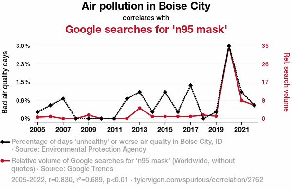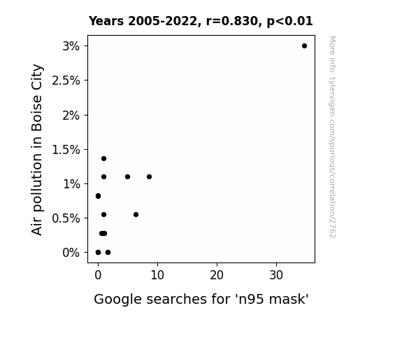 This means 68.9% of the change in the one variable (i.e., Google searches for 'n95 mask') is predictable based on the change in the other (i.e., Air pollution in Boise City) over the 18 years from 2005 through 2022.