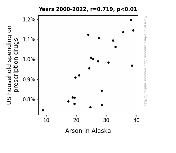 This means 51.6% of the change in the one variable (i.e., Arson in Alaska) is predictable based on the change in the other (i.e., US household spending on prescription drugs) over the 23 years from 2000 through 2022.