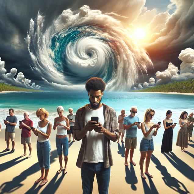 Prompt: Generate an image of Mr. Beast standing on a serene beach, surrounded by a fascinated crowd of people, each person holding a smartphone and searching "Mr. Beast" on Google. In the background, create a tumultuous sea with multiple powerful hurricanes swirling in the sky, each one vying to outdo the others in a stunning display of natural force. The scene should evoke a sense of awe and wonder at the juxtaposition of the calm beach setting and the chaotic turmoil of the stormy sea. The depiction should include only scenes, people, and objects, it should not include text or speech bubbles.