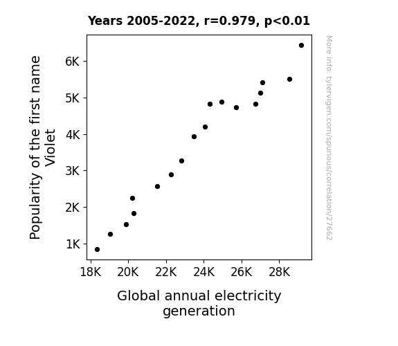 This means 95.8% of the change in the one variable (i.e., Global annual electricity generation) is predictable based on the change in the other (i.e., Popularity of the first name Violet) over the 18 years from 2005 through 2022.
