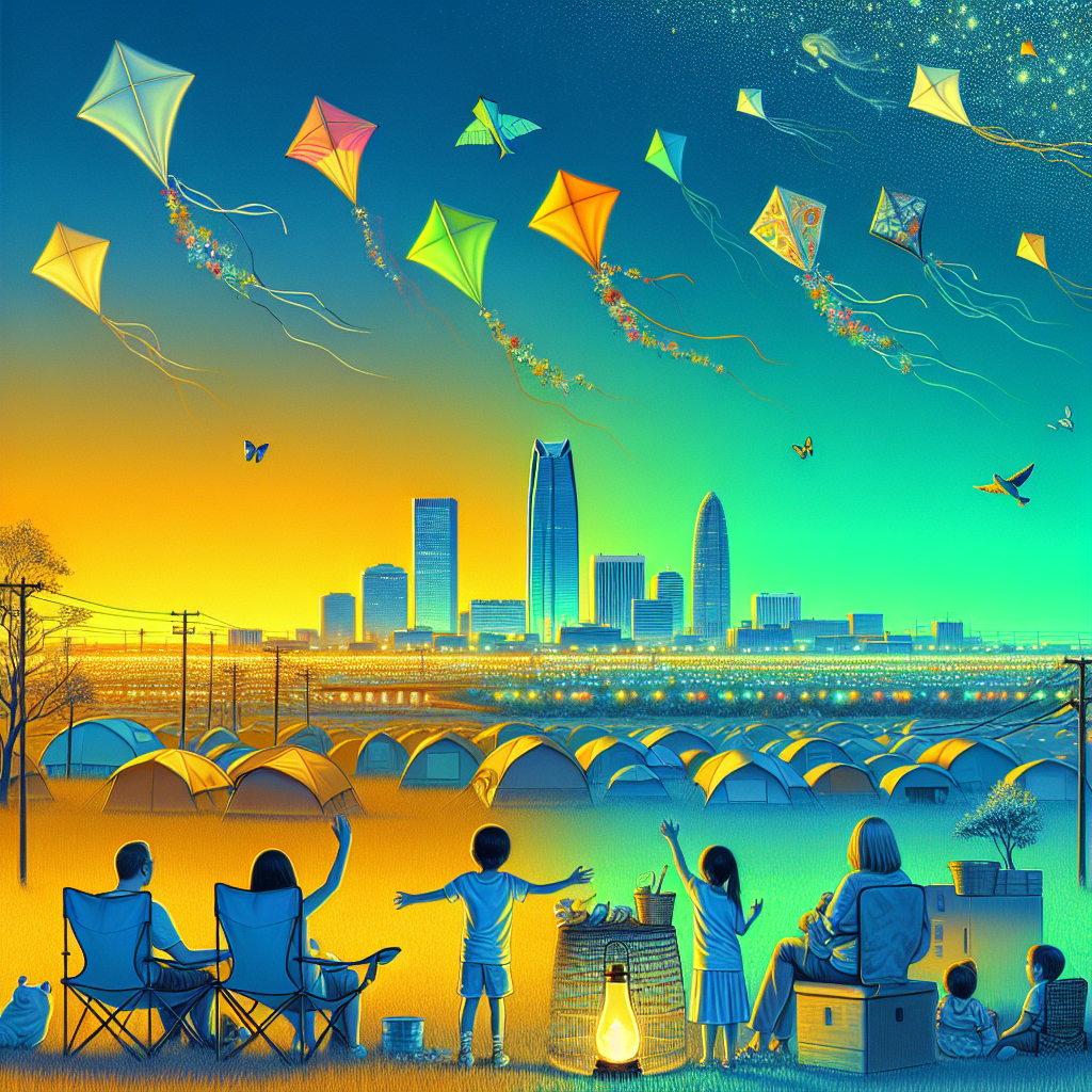 Prompt: Prompt: Generate an image of a serene Oklahoma City scene with clear blue skies and families flying colorful kites outdoors. In the distance, a traditional Japanese kite festival with kerosene lamp illumination and surging demand for kerosene to power the festivities is depicted. Illustrate the intertwined effects of improved air quality in Oklahoma City and the increased demand for kerosene in Japan due to the surge in kite flying activities. The image should evoke a calm and peaceful ambiance tying together the scenes from both places. The depiction should include only scenes, people, and objects, it should not include text or speech bubbles.