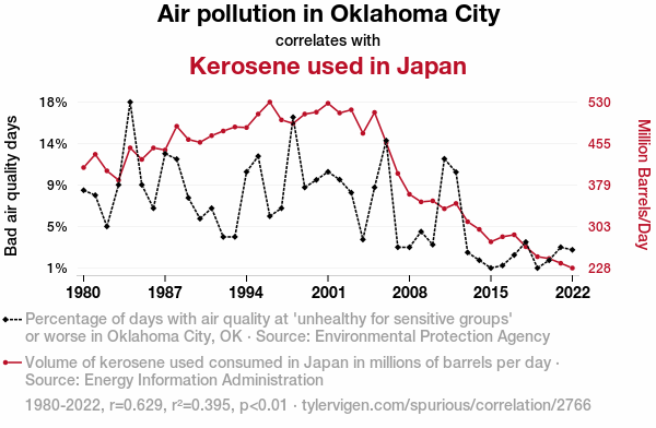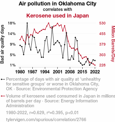 A linear line chart with years as the X-axis and two variables on the Y-axis. The first variable is Air pollution in Oklahoma City and the second variable is Kerosene used in Japan.  The chart goes from 1980 to 2022, and the two variables track closely in value over that time. Small Image
