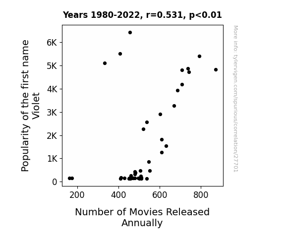 This means 28.1% of the change in the one variable (i.e., Number of Movies Released Annually) is predictable based on the change in the other (i.e., Popularity of the first name Violet) over the 43 years from 1980 through 2022.